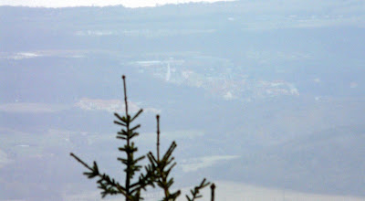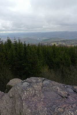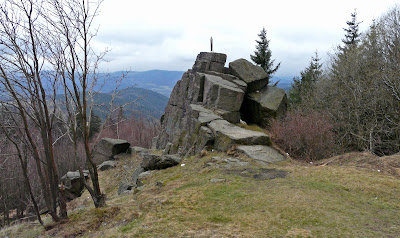 Skála na stejném kopciProtože do oběda zbývalo ještě dost času, tak jsem zalovil v navigaci a objevil ještě kešku u Sfing pod Měděncem. Sem jezdím docela často a mám to tu rád. Je tu klid, v lese za Sfingami zpívají ptáci a Vy se díváte do údolí Ohře. Dnes nebylo moc pěkně ani dole v Kadani, ale nahoře mě to docela zaskočilo. Teplota se pohybovala kolem 0°C a když jsem vystoupil z auta, tak se přihnala sněhová přeháňka. Kešku jsem našel hned, protože je maskovaná tak nápadně, až to bije do očí. Pak jsem šplhal na jednotivé skalní útvary a kochal se výhledem. Vlastně jsem marně pátral v díli, protože ta sněhová přeháňka bvyla celkem hustá a zkazila celý výhled:(