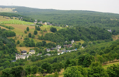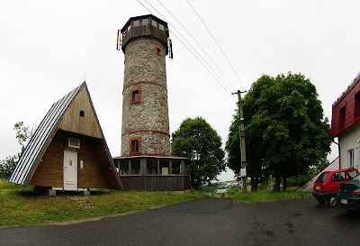 V sobotu jsme se s Janičkou rozhodli navštívit Horu sv. Kateřiny. Sice skoro celý den pršelo, ale nechtěli jsme se tu procházet. Naším cílem byla zdejší rozhledna. Při dešti je totiž sice všude mokro, ale vzduch je krásně čistý a bez oparu, takže je všude pěkně vidět a i barvy jsou kontrastnější. Vystoupali jsme tedy z Jirkova přes Boleboř až do Hory sv. Kateřiny a odtud přímo k rozhledně. Je to pěkná kamenná stavba s dřevěnou špičkou s ochozem. Nevím, jak dlouho je tu ten dřevěný ochoz, protože většina map s rozhlednami tuto rozhlednu vyobrazuje jako bílou věž bez toho proskleného ochozu. Janička musela překonat strach ze schodiště, kterým viděla dolů na patro pod nás a pak také z posledního úzkého a kývavého schodišťátka před samotným ochozem, za což jí skládám poklonu. Okna na rozhledně se nedají otevřít a tak jsem musel fotit přes sklo. Pak už jsme jen koupili turistickou známku a hurá zpátky do údolí. Škoda, že pršelo. Hory mám moc rád a kldině bych se tu procházel po těch nádherných lesních cestách kolem Jedláku.